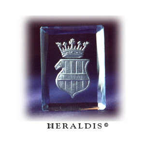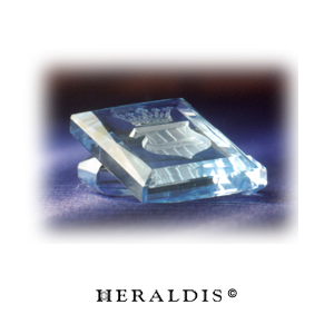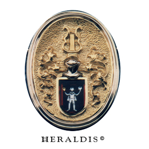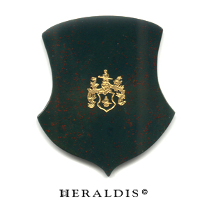 In eine große Jaspisplatte in Wappenform wurde das Familienwappen eingraviert und aufwendig mit Feingold ausgelegt. Dieser Wappenstein wurde dann in eine dekorative Holzschatulle eingelassen. Ein Schmuckstück für den Schreibtisch.