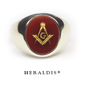 Dieser Freimaurerring ist mit einem Karneol gefasst. Der Stein ist mit dem Freimaurerwappen graviert und mit Feingold ausgelegt.
