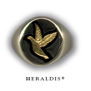 Eine in Onix gravierte Taube mit Feingold ausgelegt und im Metall wieder zisseliert.